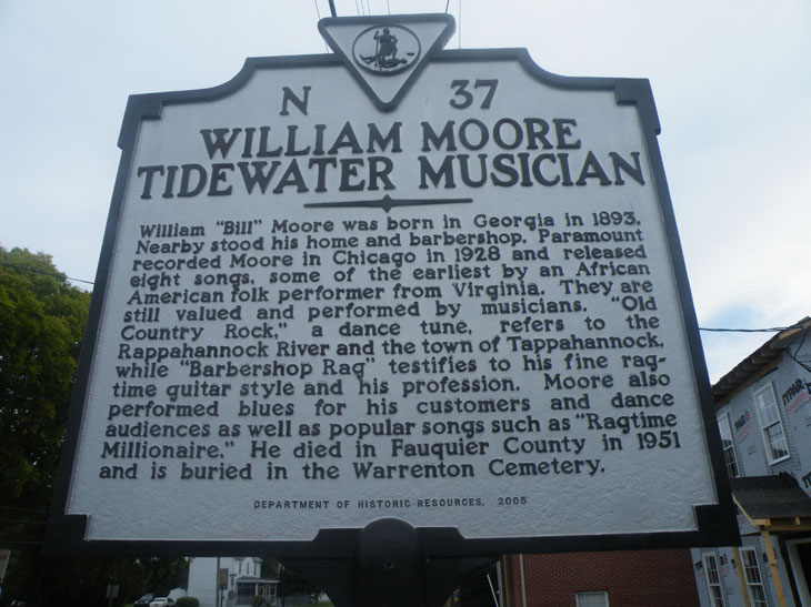 Middle Peninsula African-American Genealogical and Historical Society partnered with James River Blues Society, the Virginia Department of Historic Resources, and the Essex Public Library to erect a Virginia State Historical Marker in William Moore’s memory in the town of Tappahannock. The Moore marker, dedicated on December 3, 2005, and located across the street from the Essex Public Library, was the fourth in a series of markers erected across the state of Virginia honoring early blues pioneers. Members of Moore’s family participated in the dedication, which was followed by blues performances at the Essex Public Library. The Library mounted a display of items related to Moore’s life and the distinctive Piedmont or East Coast guitar style that Moore’s music embodied. December 3, 2005, was declared William Moore Day in Essex County by the Essex County Board of Supervisors.